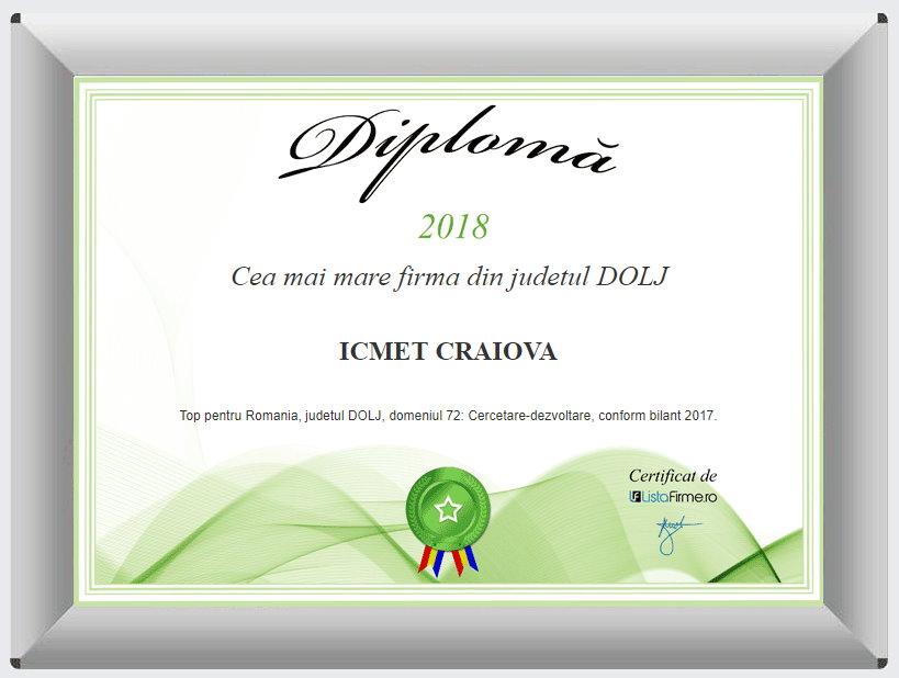 Camera de Comert si Industrie a judetului DOLJ a acordat Institutului Naţional de Cercetare-Dezvoltare şi Încercări pentru Electrotehnică - ICMET Craiova urmatoarele diplome in 2017